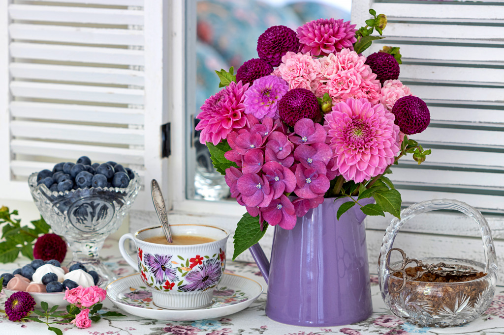 Summer Still Life with Flowers, a Cup of Coffee